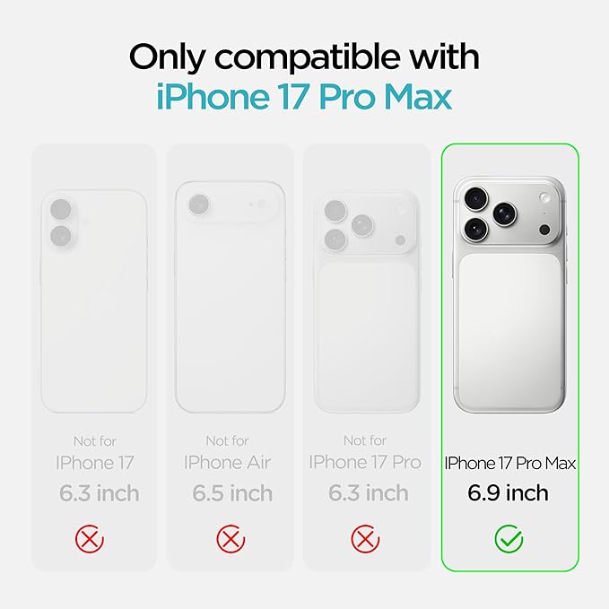 完全互換性:iPhone 17 Pro Max(6.9インチ、2025年発売)に対応。すべてのポート、ボタン、カメラに簡単にアクセスできる精密なカットアウト。注:マグネット非対応、ワイヤレス充電をサポート