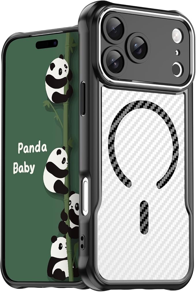 Panda Baby iPhone 17 Pro Max 用 ケース MagSafe対応 半透明 マット質感 指紋防止 耐衝撃バンパー マグネット搭載 レンズ全面保護 「おしゃれなカーボン調」 (ブラック)
