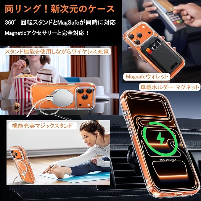 【両リング!新次元のケース】ユニークなマグネット環とリングスタンドの複合構造のデザインを採用しており、スタンドを使って携帯電話で映像や動画を見ながらワイヤレス充電ができます。無線充電器の上に平置きにして充電しかないという悩みを解決しました。スタンド機能とMagSafeが同時に対応。