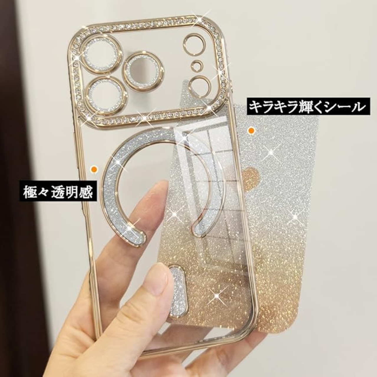 YUYIB スマホケース ケース MagSafe対応 クリア メッキ加工 ドリル ハートシール きらきら ブリンブリン かわいい おしゃれ 軽量 薄型 衝撃吸収 女性 ストラップ穴あり 磁気ケース