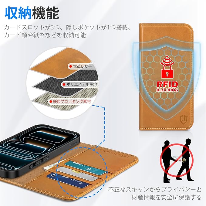 【RFIDブロッキング技術採用】本iPhone 17 Pro Maxケースのカードスロット&ポケットの裏地には、RFIDブロッキングライニングを採用しています。先進的なRFIDブロッキング技術により、信号をブロックし、ICカードの情報や個人情報などを安全に守ります。信号がブロックされるため、カードをケースに入れたまま反応しない場合は、カードを取り出してお使いください。
