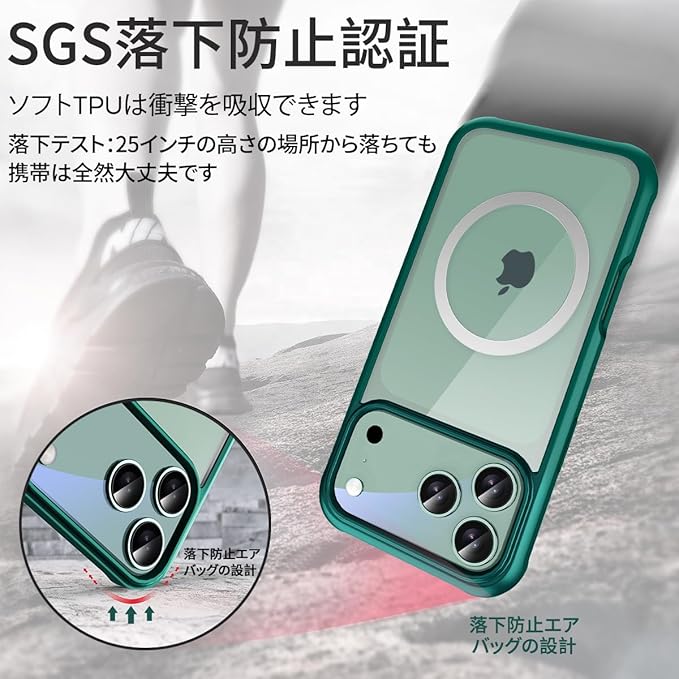 [軍用級360 全身保護]17 Pro Max Magsafe ケースはSGSの落下防止認証を取得し、両面強化ガラスとソフトTPUバンパーで作られています。 17 Pro Max Magsafe ケースは全面的な保護ができて、取り付け方も簡単です。16のスクリーンに傷つかないように 、17 Pro Max Magsafe ケースの内側にはガラススクリーンを保護するフィルムがあります。17 Pro Max Magsafe ケースには4つのエアクッション緩衝角があり、超薄型エアクッションで衝撃を減弱する技術を採用し、落ちる時の損害を防ぐことができます。