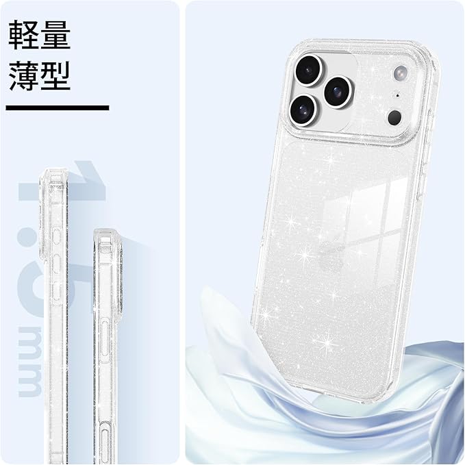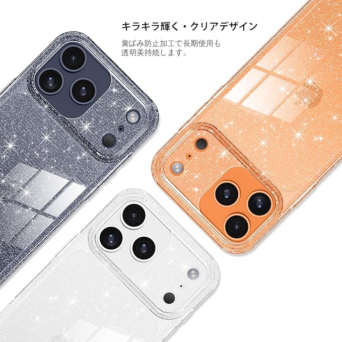 【キラキラ輝く・軽量薄型】透明TPU+PCにキラキラ粒子を練り込み、iPhone 17 Pro Max の本体色を引き立てつつ、上品な華やかさをプラス。光で変わる輝きが、日常を特別にかわいくします。薄型軽量でポケットにもすっきり。側面の滑り止め加工で持ちやすく、黄ばみ防止でずっと透明な美しさを持続。