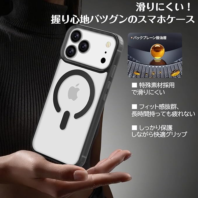 ★【半透明美学・さようなら黄ばみ】背面の特性を活かした半透明デザインで、iPhone 17 Pro Maxのかっこいいリンゴロゴが薄っり見え、高級感と神秘感を漂わせています。耐久性や耐摩耗性に優れたポリカーボネートの背面は、長く使っても綺麗な印象で、絹のようなマットな質感で、サラサラして触り心地が良いです。誰にでも似合う落ち着いた質感で、惚れ惚れ眺め・触りたい感じです。背面が艶消しマット質感でまるでベルベットのように優しく心地よいを楽しめ、優しい手触り触るだけで心が癒される。さらに、マット質感 ベルベット触感のハイブリッド設計で、指紋付着率を従来比75%低減。半透明+黒の二色構造で黄ばみの心配が一切なく、黄ばみに悩んでいる方に大正解!までにない耐久性を誇り、何年使っても十分です!