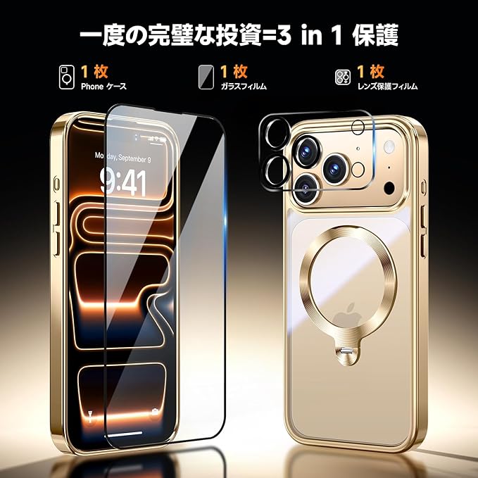 【三重保護セット!上品なメタリック光沢】OYR iPhone 17 Pro Max用クリア ケース Magsafe 対応[360 回転CD スタンド・10 万回開閉テスト][メッキバンパー・iPhone専属色][カメラ保護とガラスフィルム付き]ストラップホール付き マグセーフ アイホン17プロマックスケース マホケース17 Pro Max 人気 米軍MIL規格取得・耐衝撃(6.9インチ・ゴールド)