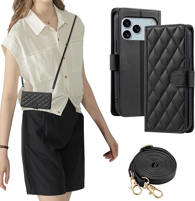 laddutoi ケース 用の iphone 17 pro max ケース 防塵 おしゃれ ストラップ付き スタンド機能 カード収納 軽量 薄型 耐衝撃 高級PUレザー 滑り防止 財布型 内蔵マグネット 開閉式 チェック柄 上質 耐摩擦 マグネット式 肩掛け 斜め掛け-くろい