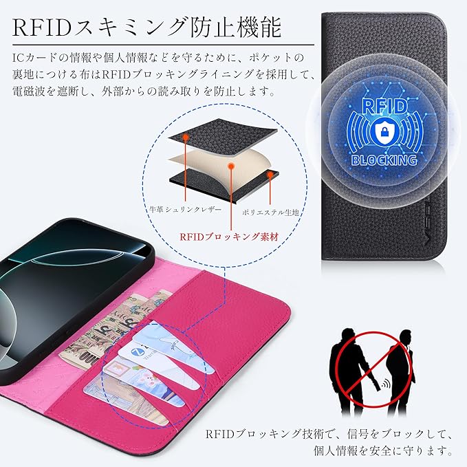 RFIDブロッキング技術・選ばれる理由:ICカードの情報や個人情報などを守るために、カードスロットとポケットの裏地につける布はRFIDブロッキングライニングを採用しています。カードを入れたまま、反応しない場合があり、使用する時はカードを出してから、利用してお願い致します。