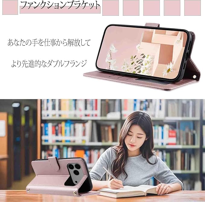 カード収納:iphone 17 pro max 手帳型ケースの内部には3つのカードスロットと1つの空きポケットがあり、交通系カード、日常的に使う銀行カード、写真なども簡単に収納できます。前面はマグネットボタンでしっかりと閉じられるため、財布としても活用可能です。これにより、スマホだけを持って外出して買い物ができるようになります。さらに、映画鑑賞やビデオ通話の際にスタンドとして折りたたむことができ、お好みの角度で動画視聴や読書などを楽しむことができます