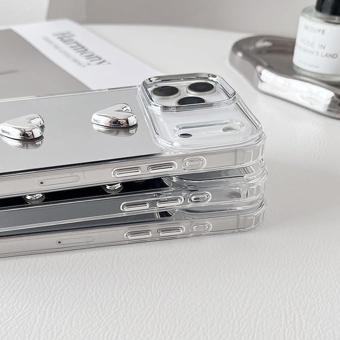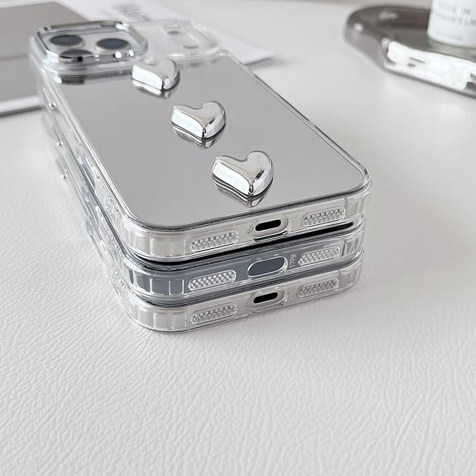 ZTOFERA iPhone 17 Pro Maxケース用、かわいい3Dハートミラーガールズ女性メイク電話カバー 、シルバーハート型透明iPhone 17 Pro Maxスマホケース用、5つの心