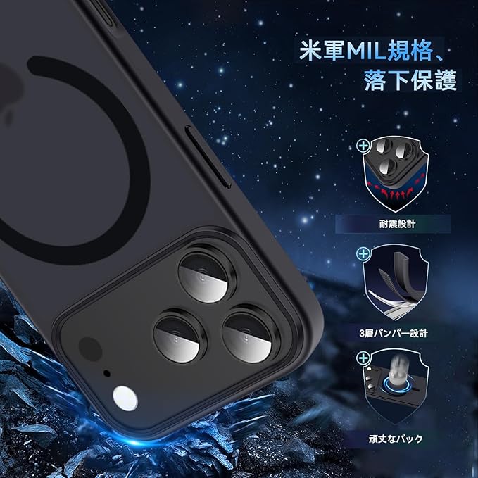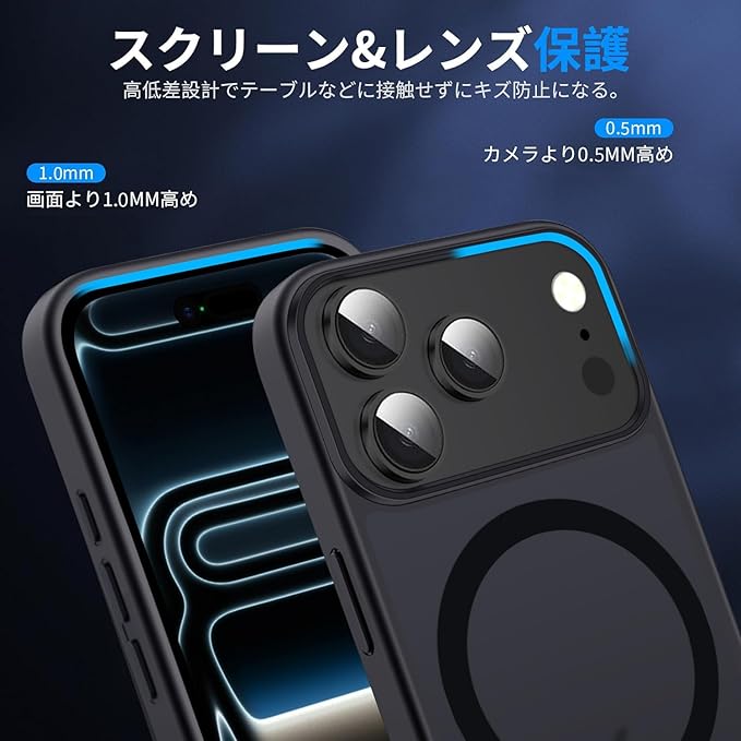 iPhone 17 Pro Max 用 ケース カバー 1枚ガラスフィルム付き 半透明 MagSafe対応 TPU+PC ワイヤレス充電対応 マグネット搭載 強化ガラス 耐衝撃 グーグル アイフォン17promax カバー 神秘的な肌感 自動吸着 高透過率 気泡ゼロ 指紋防止(ブラック)