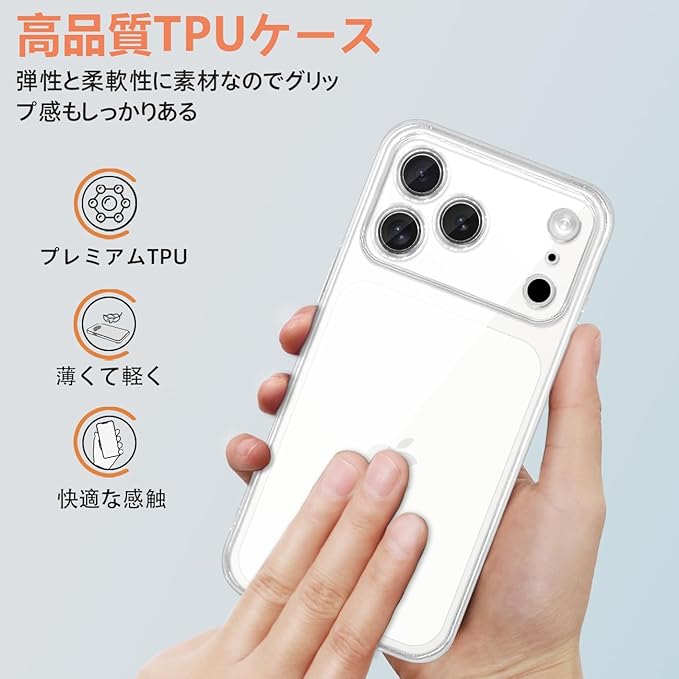 【耐衝撃、全面保護】 いphone17 ProMax ケース は柔らかいTPU素材を使用し、本体との擦れを防げ、柔軟性が高く、着脱が簡単で。スクリーンやカメラ周辺の縁を高くすることで傷から保護します。四つ角にも側面にも耐衝撃クッションを搭載したことで、落下時のダメージを最小限に抑えることが可能です。大事なデバイスを全面保護します。