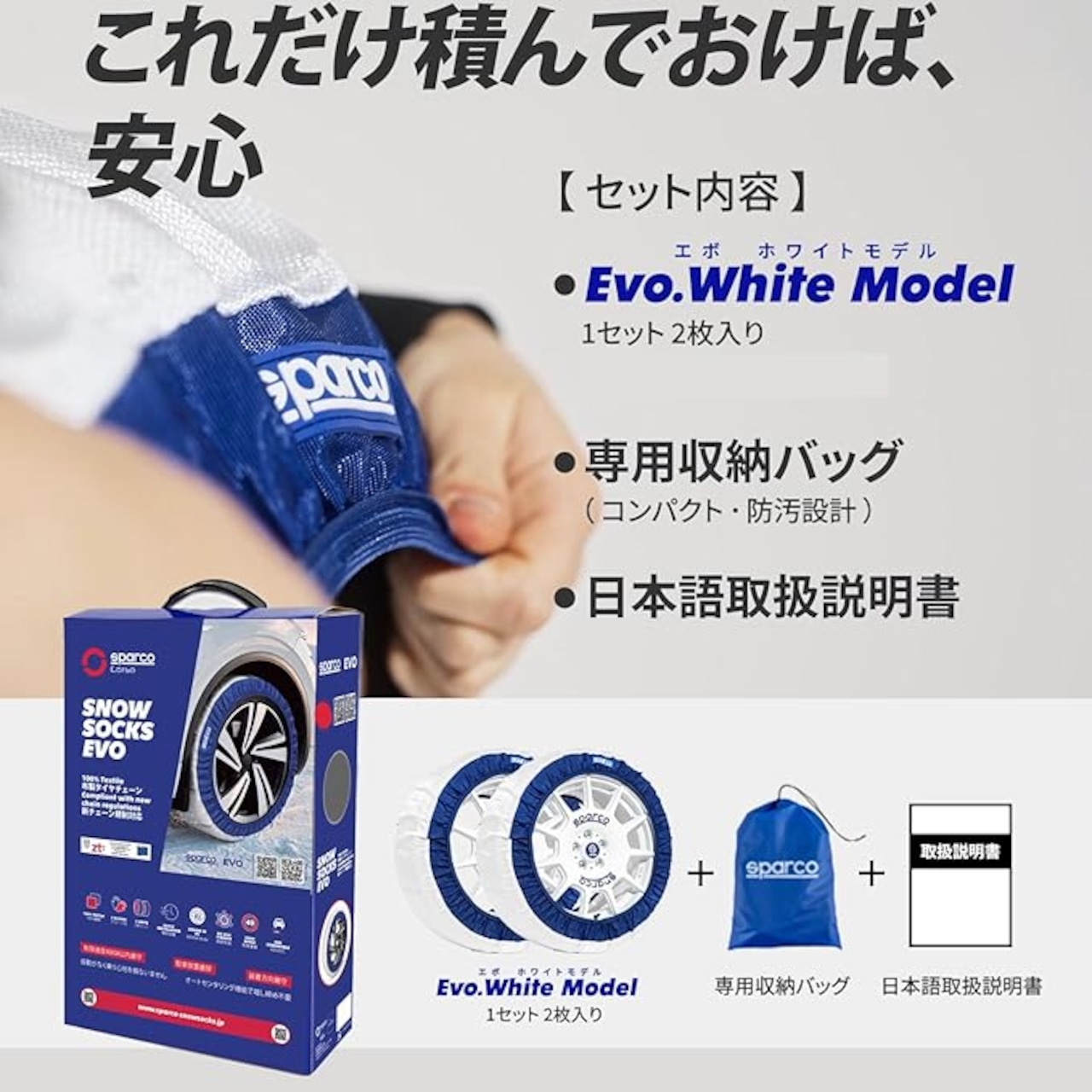 新チェーン規制対応。世界中のモータースポーツシーンで信頼されるSPARCOブランドが提供する安心の品質。SPARCOスノーソックスは国際的な安全基準である欧州冬季用タイヤ滑り止め装置規格EN規格を取得した信頼の雪道対策アイテムです。急な積雪にも安心。軽量でコンパクトに収納でき非金属タイプで工具不要、誰でも簡単に装着できます。