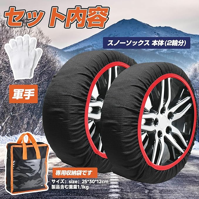 【商品内容】:布制タイヤチェーン 2、専用収納パック 1、手袋 2(1セットには2輪分収納されています。4輪に装着希望の場合は2セットでご注文ください)【梱包サイズ】:24cm*28cm*11cm【重量】:1.05kg【素材】:ポリエステル(PLY)