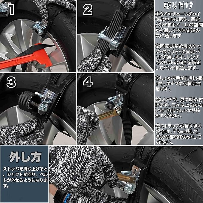 ★【パッケージ内容】本体:タイヤチェーン8本(ひとつタイヤーには4本、駆動タイヤ用)付属品:ベルト通し用取付道具(ミニスノースコップ) 1 グローブ 1 収納パック 1 日本語取扱説明書 1。不具合があった場合、6ヶ月以内であれば返品・交換が可能。