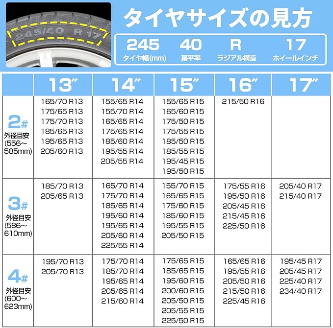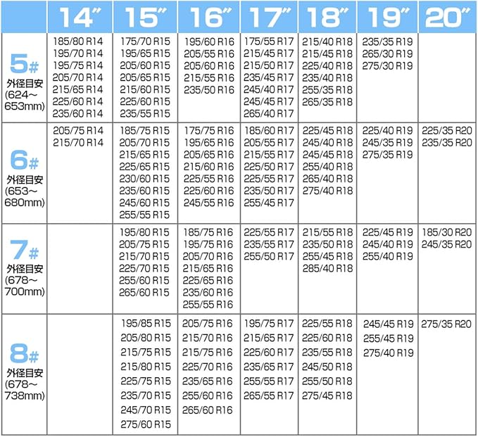 適合車両のタイプ (6#)205/75 R14 215/70 R14 185/75 R15 205/70 R15 215/65 R15 225/65 R15 230/60 R15 235/60 R15 245/60 R15 255/55 R15 175/75 R16 195/65 R16 205/65 R16 215/60 R16 225/55 R16 225/60 R16 245/55 R16 185/60 R17 205/55 R17 215/55 R17 225/50 R17 225/55 R17 235/50 R17 255/45 R17 225/45 R18 245/40 R18 245/45 R18 255/40 R18 265/40 R18 275/40 R18 225/40 R19 245/35 R19 275/35 R19 225/35 R20 235/35 R20(6#)205/75 R14 215/70 R14 185/75 R15 205/70 R15 2… 表示を増やす