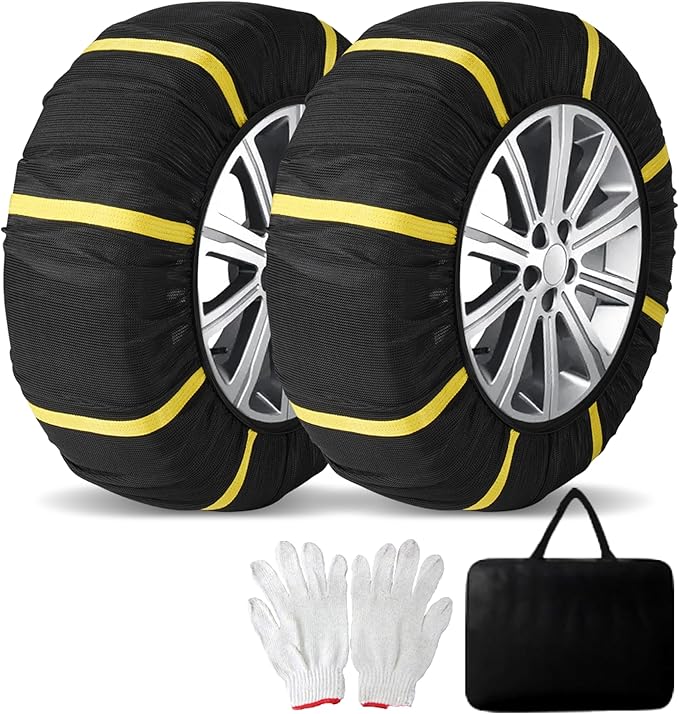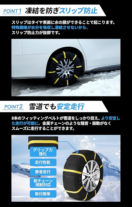 【優れたグリップ性能】 布製タイヤチェーンは、雪や氷の上でのグリップ性能が向上し、滑りにくくなります。特に雪道や凍結路面での走行時に役立ちます。