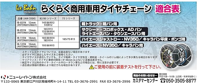 NEWRAYTON(ニューレイトン) アイスバーン 軽トラック・軽バン専用らくらくタイヤチェーン 商用車用 横滑りにも強い金属亀甲型 リング式12mm 【適合:145/80R12 145R12】 締め付け時に緩みにくいスライドギア仕様 ジャッキアップ不要の簡単取付タイプ 12㎜リングで快適性、静粛性向上 IB-021N
