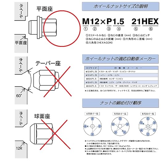 M12 P1.5の適合車種は、トヨタ・三菱の純正アルミホイールの平面座用です。それ以外の車種は不適合ですのでご注意願います。