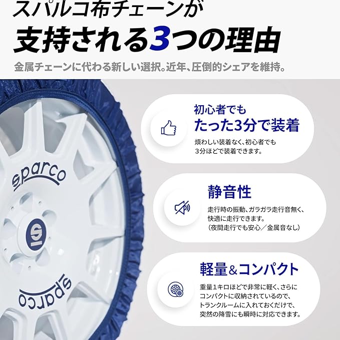 新チェーン規制対応。世界中のモータースポーツシーンで信頼されるSPARCOブランドが提供する安心の品質。SPARCOスノーソックスは国際的な安全基準である欧州冬季用タイヤ滑り止め装置規格EN規格を取得した信頼の雪道対策アイテムです。急な積雪にも安心。軽量でコンパクトに収納でき非金属タイプで工具不要、誰でも簡単に装着できます。