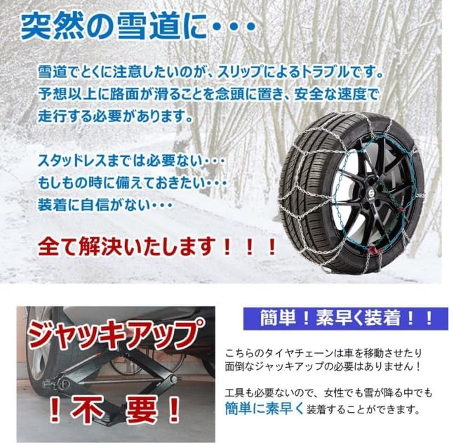■ジャッキアップ不要で取り付け可能 ■横滑りに強く静寂性に優れた亀甲型 ※事前に、取り付け、取り外し練習を行ってください ※タイヤチェーン装着時は30km/h以下で走行してください。(高速道路も同様)※この商品はラジアルタイヤ(夏用タイヤ)基準となっております。スタッドレスタイヤなど、一部装着できない場合があります。※装着にはタイヤと車体の間隔(クリアランス)が5cm以上必要です。また、車体と積載物の合計重量が2t以内でないと装着できません。