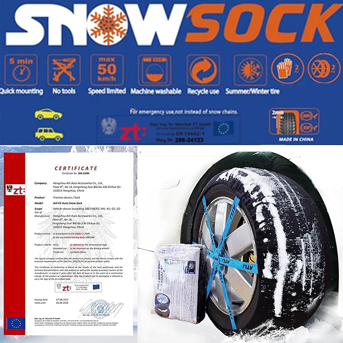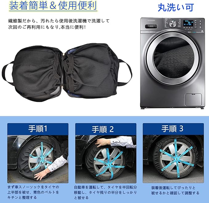 【装着簡単ジャッキ不要】:ただ3Stepで(スノーソックをタイヤの上半部を被せ、車を半回転分移動して、残りの半分を被せる)、一人でも数分だけで簡単に完成です!取り付け簡単。使用後洗濯して次回のご再利用にもなります。簡単装着、ジャッキアップ不要、持ち運びの利便性。軽自動車、乗用車用スノーチェーン。2025新改良軽量タイヤソックス、静音、振動無し、騒音無し、タイヤを傷まない。