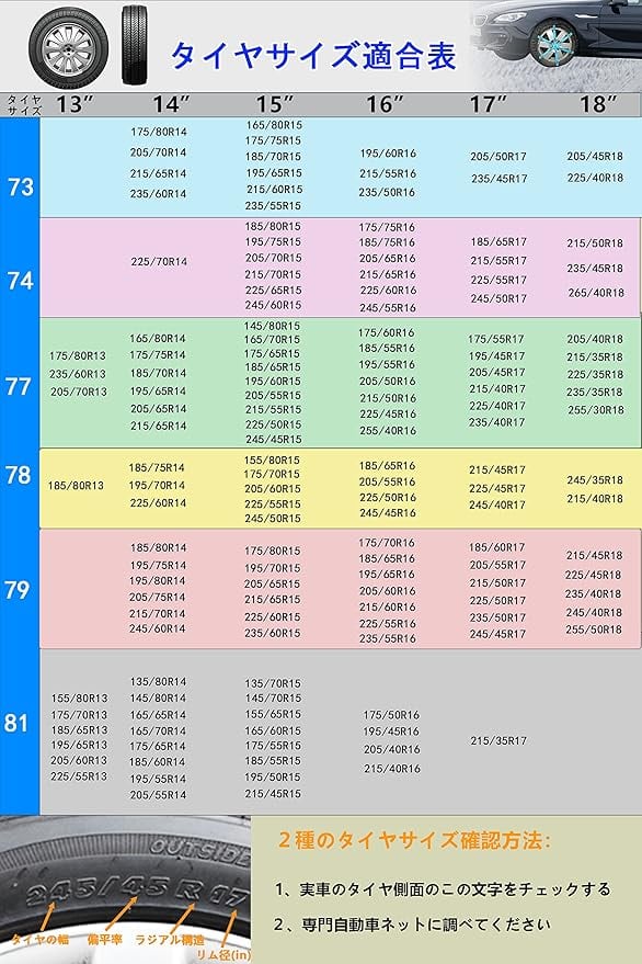 【多種サイズ幅広い適合性正規品】:このシリーズは約203種のタイヤのサイズを提供して、多くの自動車に対応できるスノーチェーン。チェーン規制適合。ご購入する前に、タイヤサイズによって相応なタイヤチェーンを確認してください。適合表の選択方法は写真にご参考ください。175/80R13 205/70R13 235/60R13 215/60R14 165/80R14 175/75R14 185/70R14 205/65R14 145/80R15 165/70R15 175/65R15 195/60R15 205/55R15 225/50R15 255/45R15 175/60R16 185/55R16 205/50R16 225/45R16 255/40R16 175/55R17 195/45R17 215/40R17 205/40R18 235/35R18 255/30R18。