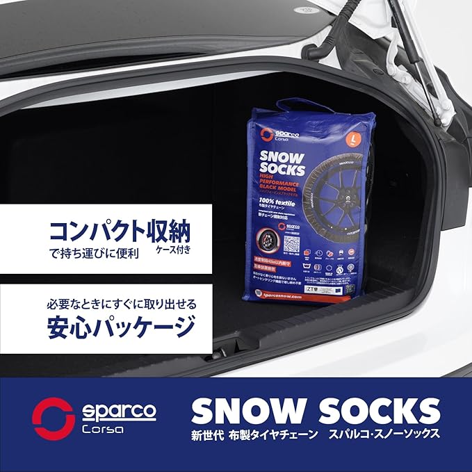 100% Made in Europeの最高品質テキスタイル(布製)スノーチェーン。新チェーン規制対応品です。チェーン規制対象路線では、大雪の時にはスタッドレスタイヤであってもチェーンの装着が義務付けられました。全国的に導入エリアが拡大しています。「スパルコ・スノーソックス」の高品質ポリエステル繊維は最も厳しいスノーチェーンの規格「 NORM」を取得しています。高いグリップ力で日本の雪路においても、圧雪、深雪、アイスバーンなどのコンディションにおいて安定した走行を提供いたします。