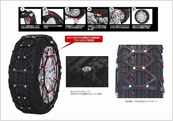●エコメッシュIIタイヤサイズ適合表及び不適合車種一覧表、不適合タイヤを必ず確認してください。●必ず時速50㎞以下で走行してください。●急発進、急ハンドル、急ブレーキは絶対避けてください。●商用車等には使用しないでください。●砂利道走行は避けて下ください。●必ず装着タイヤに適合したサイズか確認してください。●タイヤと車体のすき間(クリアランス)は2.5cm以上必要です。●必ず駆動輪へ取付けてください。FF車(前輪駆動車)は前輪へ、FR車(後輪駆動車)は後輪へ取付けてください。4WD車は車両の取扱説明書に従ってください。