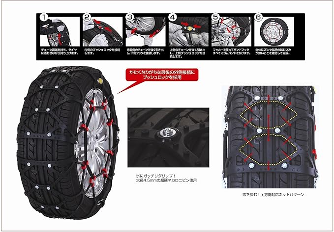 ●エコメッシュIIタイヤサイズ適合表及び不適合車種一覧表、不適合タイヤを必ず確認してください。●必ず時速50㎞以下で走行してください。●急発進、急ハンドル、急ブレーキは絶対避けてください。●商用車等には使用しないでください。●砂利道走行は避けて下ください。●必ず装着タイヤに適合したサイズか確認してください。●タイヤと車体のすき間(クリアランス)は2.5cm以上必要です。●必ず駆動輪へ取付けてください。FF車(前輪駆動車)は前輪へ、FR車(後輪駆動車)は後輪へ取付けてください。4WD車は車両の取扱説明書に従ってください。