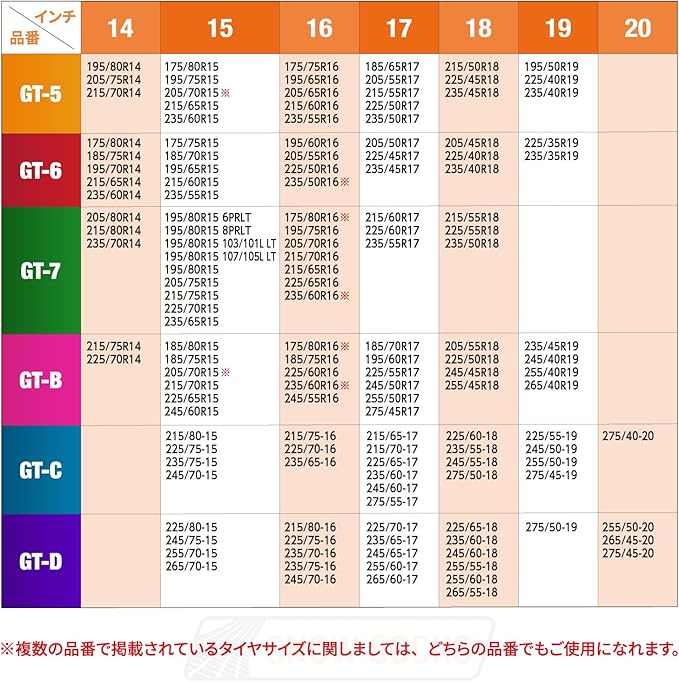 GT-B 対応タイヤサイズ 215/75-14 225/70-14 185/75-15 185/80-15 205/70-15 215/70-15 225/65-15 245/60-15 175/80-16 185/75-16 225/60-16 235/60-16 245/55-16 185/70-17 195/60-17 225/55-17 245/50-17 255/50-17 275/45-17 205/55-18 225/50-18 245/45-18 255/45-18 235/45-19 245/40-19 255/40-19 265/40-1