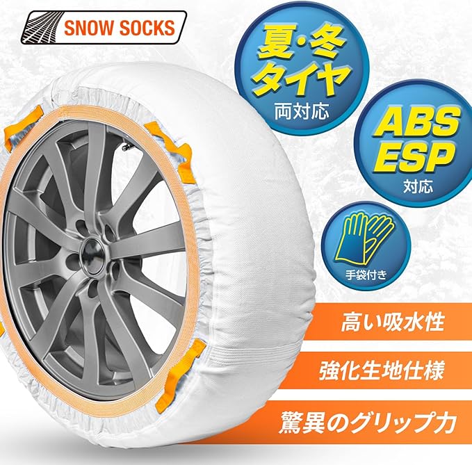 ソックスの名のとおりタイヤに簡単に履かせられ、走行中は金属チェーンがぶつかる音がないので静かです。