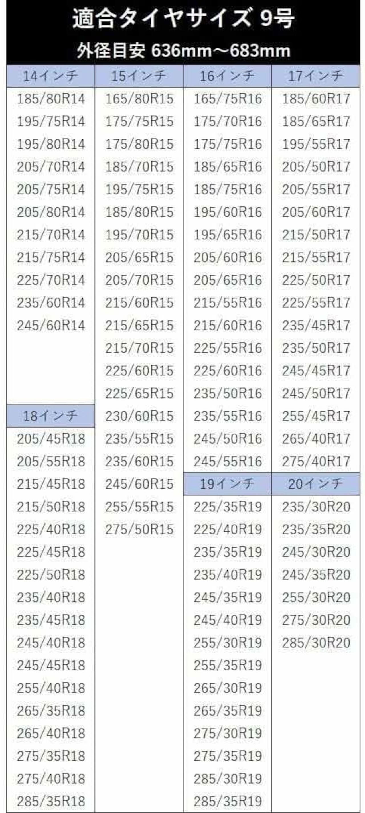 適合タイヤサイズ(9号) 外径目安(636mm~683mm)