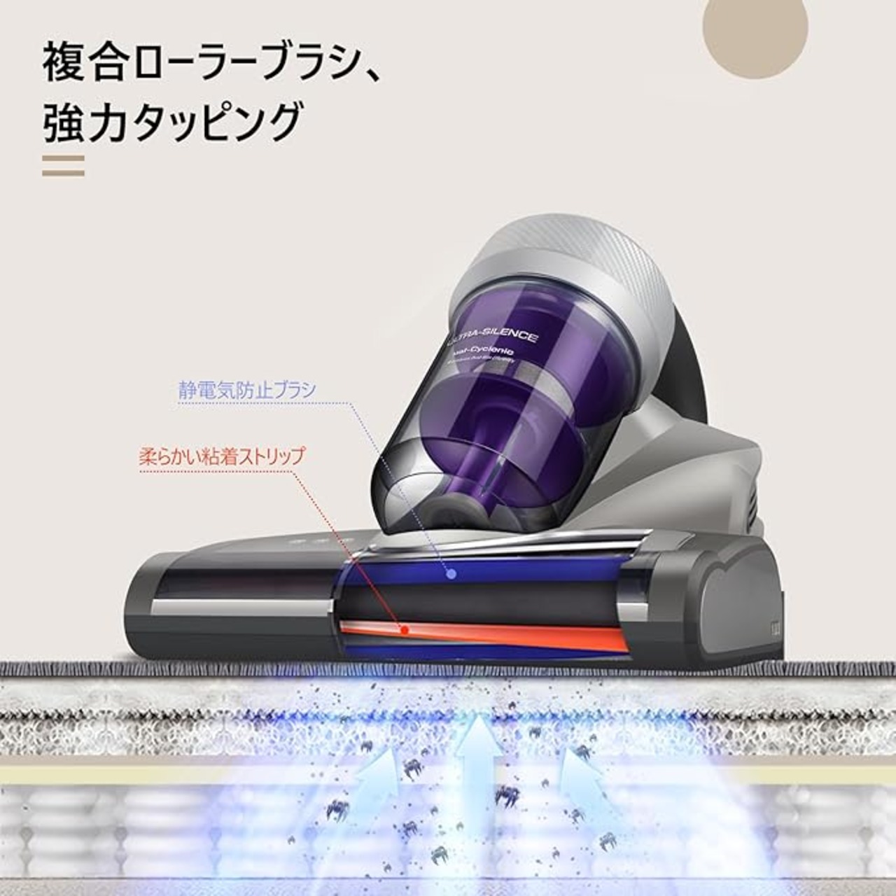【パワフルな打ち付け】:特殊なソフトラバー複合回転ブラシで布団の奥深くをパワフルに叩き、ダニを排除。静電気防止毛ブラシで生地を保護し、表面を傷つけない。