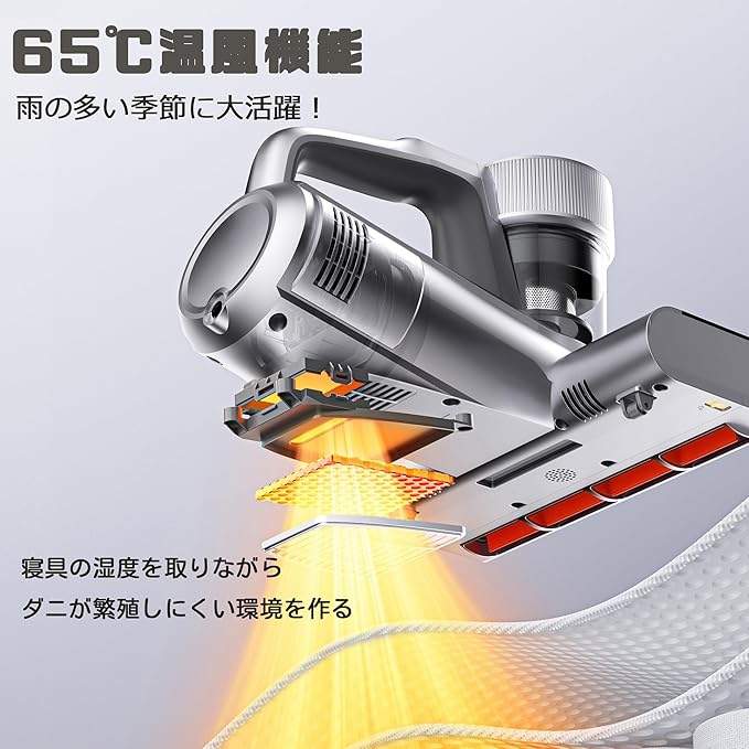 【65 温風機能搭載】: 約65 温風で布団をふっくら温め、寝具の湿度を取りながらダニが繁殖しにくい環境を作る。本体底面から最高65℃の温風を吹き出し、ふとん掃除しながらふとん表面だけではなく奥までしっかり除湿。雨の多い季節に大活躍!