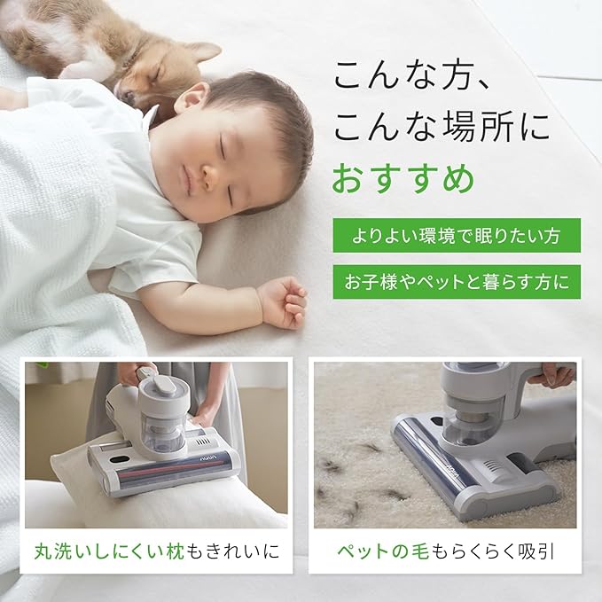 【家族の睡眠を守る布団クリーナー】成人の平均睡眠時間は1日7時間~8時間。赤ちゃんの平均睡眠時間は1日16時間~20時間。これだけの長時間過ごすふとんは健康のためにも綺麗にしたい。そのためAQUAのふとんクリーナーは徹底的に「清潔さ」にこだわりました。