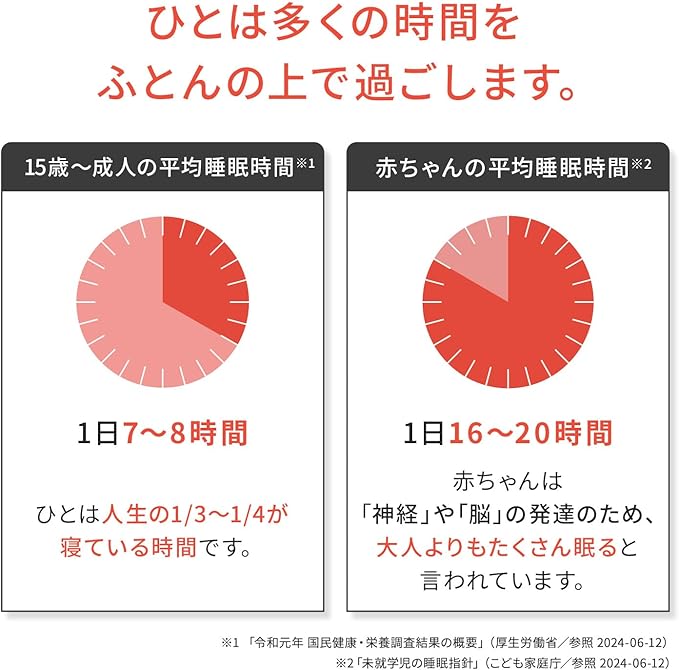 成人の平均睡眠時間は1日7時間~8時間。赤ちゃんの平均睡眠時間は1日16時間~20時間。これだけの長時間過ごすふとんは健康のためにも綺麗にしたい。そのためAQUAのふとんクリーナーは徹底的に「清潔さ」にこだわりました。