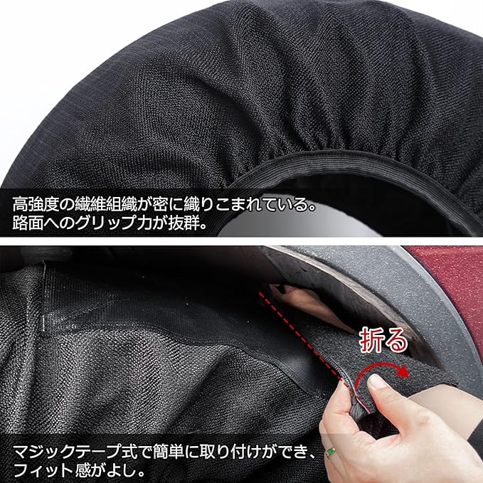 【取り付け簡単】スピード制限:時速40km以下;ジャッキアップが不要、タイヤに被せて、タイヤのサイズに合わせて、調整して、マジックテープで止めるだけ、とても簡単です。前輪駆動車は前輪に、後輪駆動車は後輪に装着してください