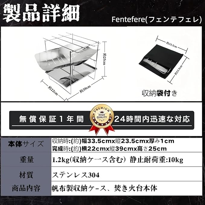 【高耐久設計&1年間保証】高品質のステンレス鋼を採用し、優れた耐久性と変形しにくい特性を備えています。頑丈で長期間使用可能です。このストーブはステンレス製のため完全に洗浄でき、錆の心配がありません。タキビダイ製造不良時は無償修理・交換対応,年間を通じて24時間以内の迅速な対応。