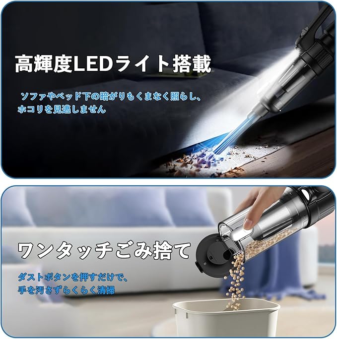 【ワンタッチダスト排出&LED照明でストレスフリー設計】 ボタン一つでダストボックスを即開放、手を汚さず衛生的にゴミを廃棄。暗所でもLEDライトがほこりの位置を明示し、ベッド下やシートの隙間を見逃しません。