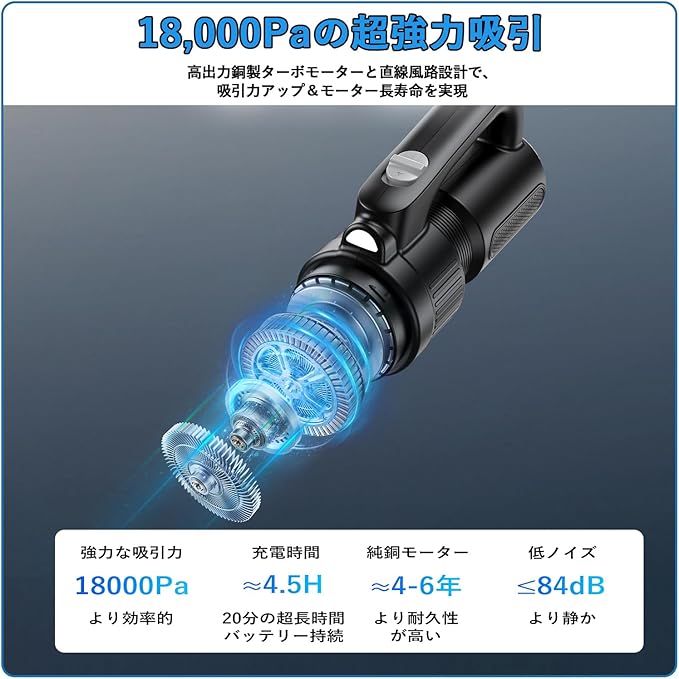 【一人暮らし おすすめ】のコンパクト性能。小型ながら強力吸引(18000PA)で、狭い部屋も効率的にクリーニング。