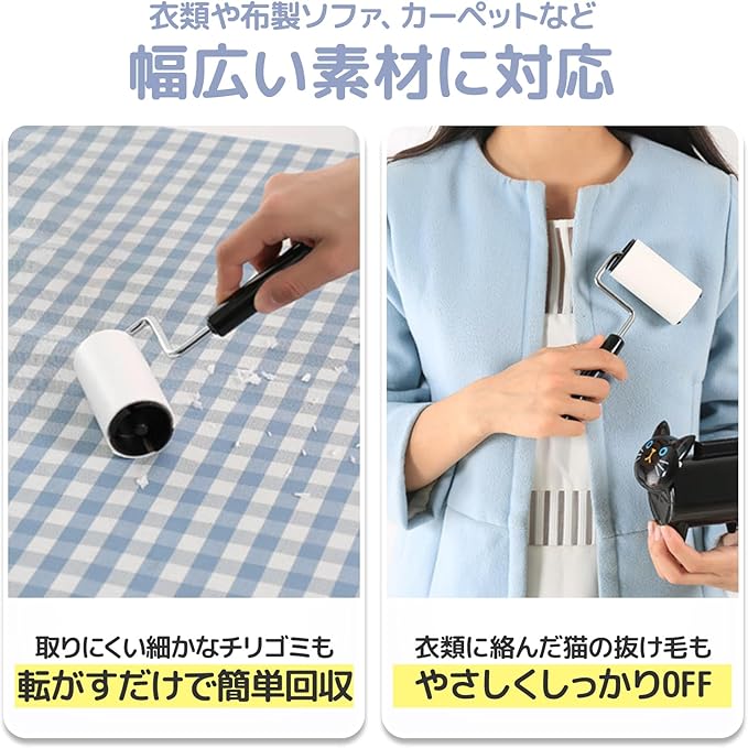 【ねこの毛もスッキリ除去】ねこの抜け毛が気になる衣類や布製品にも粘着力がしっかり働き、毎日の掃除が手間なく簡単にできて清潔な空間を保つことができます。