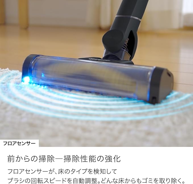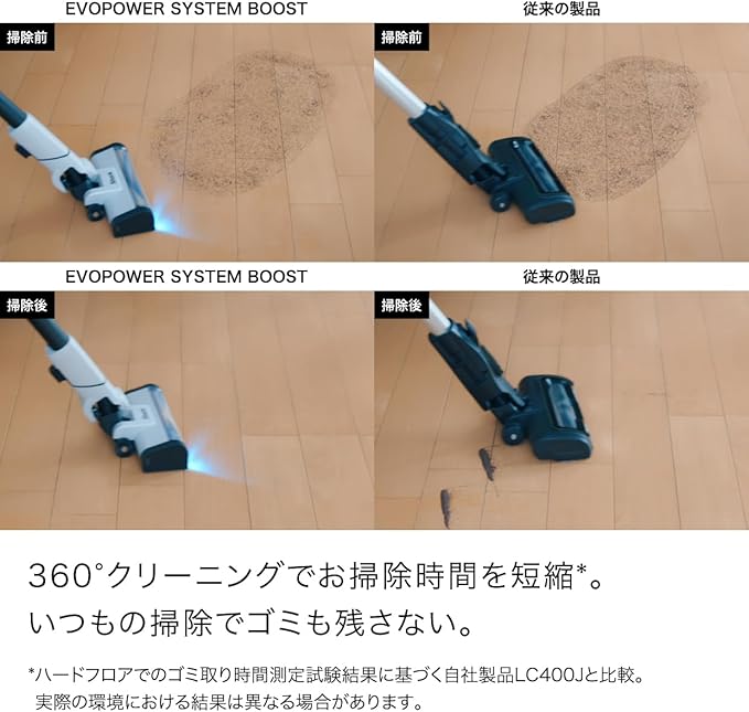 床において従来よりも2倍の静かさ*/新開発のブラシロールにより、フローリングとカーペットにおいて従来よりも2倍の静かさを実現* *自社試験結果。音響パワーの測定・算出結果に基づく自社製品LC400Jとの比較。