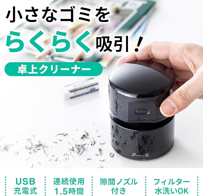 机の上の小さいゴミやホコリを手軽にクリーニングできる卓上クリーナーです。