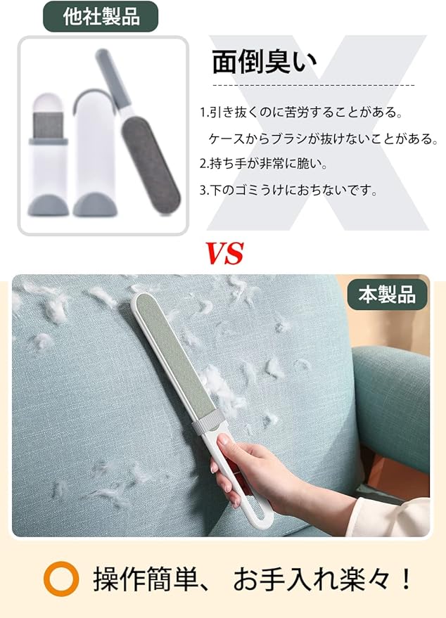 【両面ブラシ】両面ブラシ設計どちらの面も使用できるので、より多くのほこりが取れます。片面ブラシの 2 倍の速さで毛や糸くずを取り除きます。無限にほこりを取り続けられるブラシです。猫や犬などのペットがよく滞在する場所(ソファー、犬/猫ベット、 キャットタワー、布団、カーペット)の清掃に大活躍!