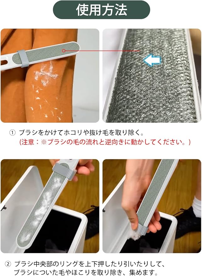 【使用便利】掃除が終わったら、ブラシ中央部のリングを上下押したり引いたりして、ブラシについた毛やほこりを取り除き、集めます、お手入れ楽々です。持ち手が長くて持ちやすい、片手で簡単に操作できます。長時間使っても疲れません。ハンドルは中空です、使用しない時は、壁にぶら下がられ、収納しやすいです。