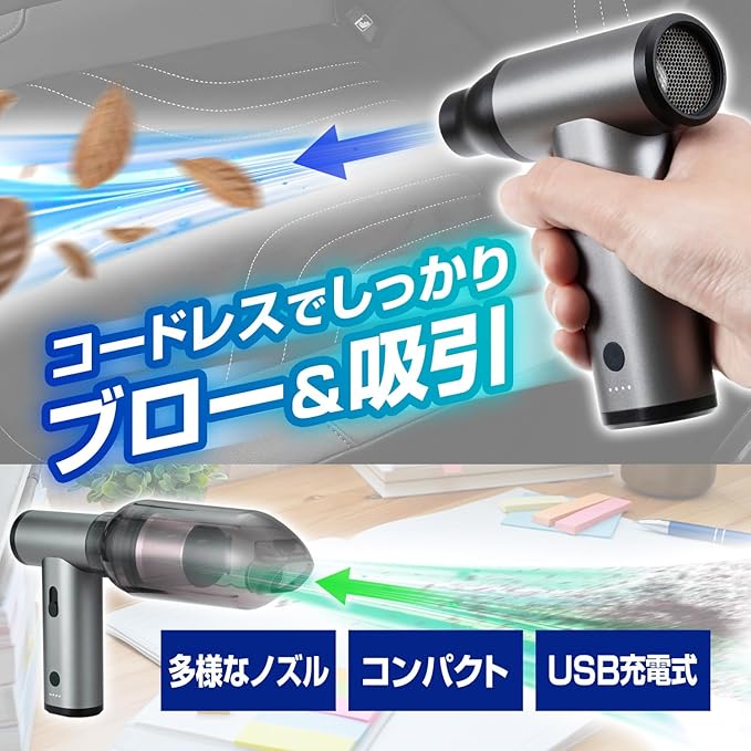 【1台多役!吹き飛ばし/吸引でクリーンに】エアブローと掃除機の機能を併せ持った製品。吹き出し/吸い込みに加え、空気入れ/圧縮にもマルチに使えます。