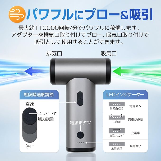モーター最高回転数 1分間で約110000回転 高速回転で風力も強力です。