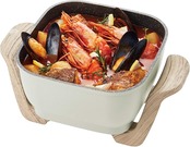 テーブル調理に最適!火を使わない手軽さが◎ 軽量&コンパクトなので、持ち運びもラクラク。収納場所にも困りません。パーツが少なく、電源コードを外して鍋を洗うだけでお手入れ終了。 焦げ付きにくいふっ素加工だから、汚れを落としやすい!(※つけおき洗い不可)