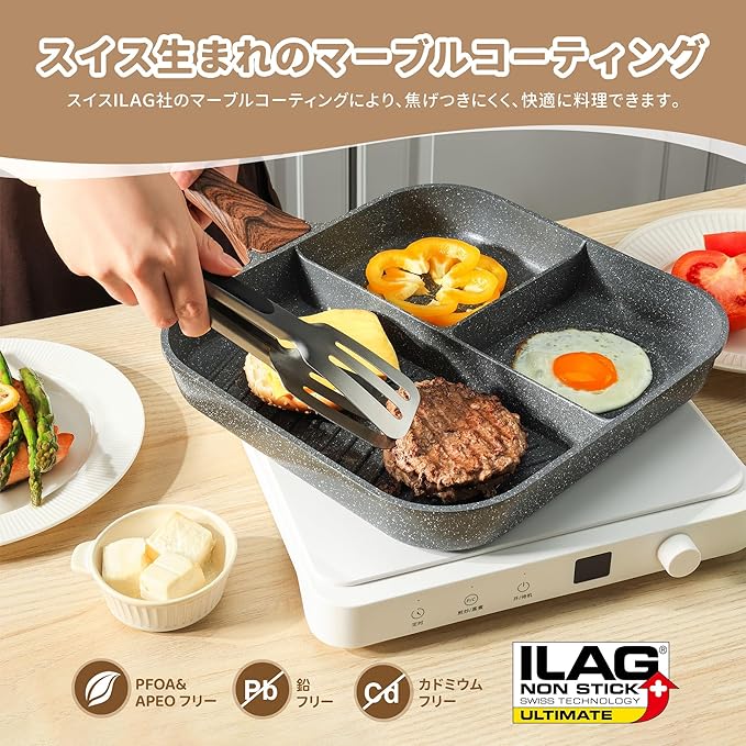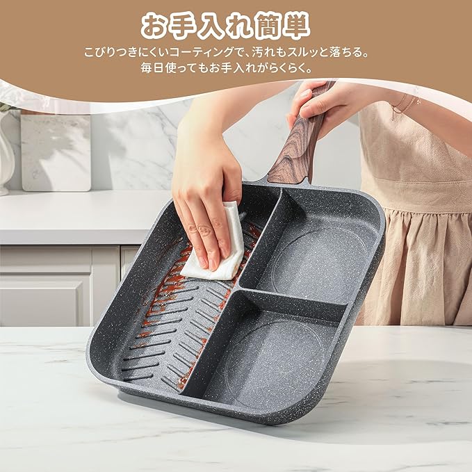 SENSARTE 仕切り付きフライパン マーブルコート 24cm IH ガス グリルパン 3分割 角型フライパン くっつきにくい 一年保証 グレー
