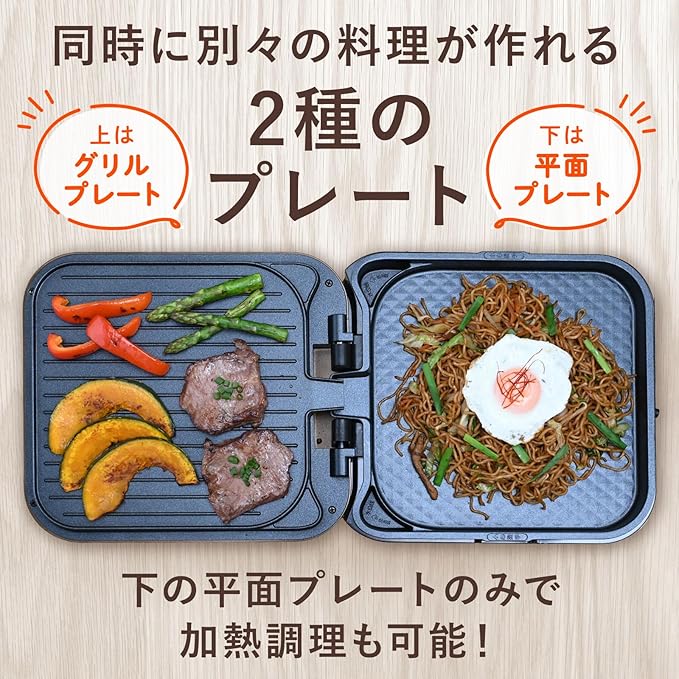 同時に別々の料理が作れる2種のプレート ・上はグリルプレート・下は平面プレート ・下の平面プレートのみで加熱調理も可能!
